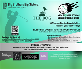 It’s a race to the finish line, literally. This is a different twist on the traditional golf outing and you can golf as many holes as you'd like in one day at Big Brothers Big Sisters of Washington County's 10th Golf Marathon fundraiser on Tuesday, October 14th at The Bog in Saukville, WI. Registration and breakfast will be from 8-8:45am, with a shot-gun start at 9am. Awards, celebration and food will start around 3pm!
